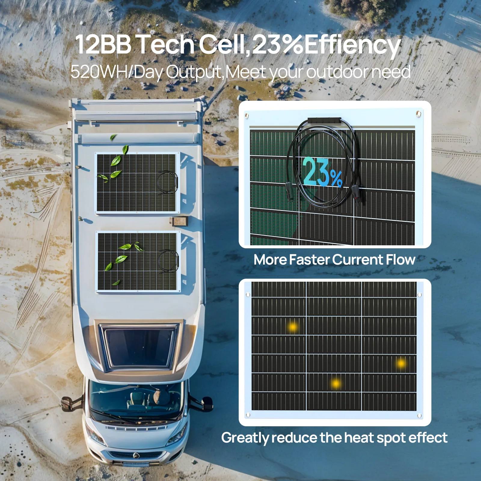 The 12BB Flexible Solar Panels deliver an unparalleled combination of performance, efficiency, and portability, making them the ideal choice for RV enthusiasts seeking eco-friendly energy solutions. Featuring dual panels—each with 130 watts—this powerhouse offers a combined 260W output. Designed with high-efficiency monocrystalline technology boasting a 23.5% conversion rate, these solar panels ensure optimal energy harvest even under challenging weather conditions.