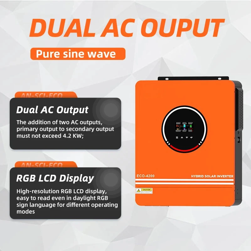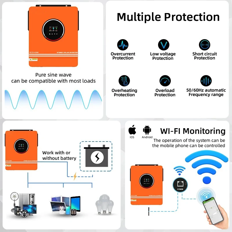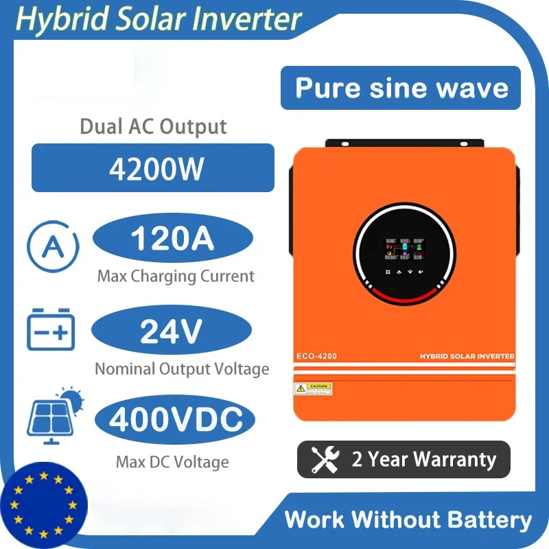 Designed to meet your off-grid electricity needs, the 4200W Hybrid Solar Inverter is a powerhouse of innovation that combines efficiency and reliability. Featuring a pure sine wave output, it ensures seamless compatibility with your home appliances while delivering maximum performance. The 24V 230V system guarantees stable power distribution, offering peace of mind during operation even in challenging energy environments.