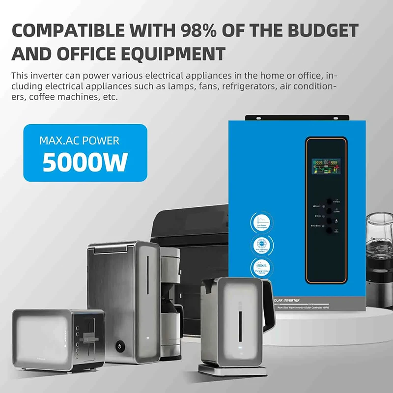 The device is also compatible with 110V voltage systems, ensuring easy integration with a wide range of electrical setups. With its hybrid design, this solar inverter efficiently combines the advantages of solar energy and conventional electricity grids, enabling sustainable and cost-effective energy consumption.